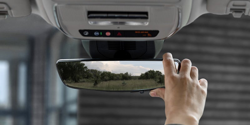 Rear Camera Mirror5 uses a camera to provide you the option of using a wide and less obstructed view behind your vehicle while driving instead of a traditional rearview mirror. The feature also allows brightness, vertical tilt and zoom adjustments.