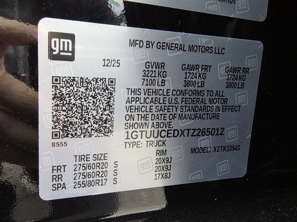 Price includes: $1500 - GM Bonus Cash. Exp. 02/02/2026 $1750 - Buick & GMC Consumer Cash Program. Exp. 02/02/2026 Sierra 1500 Elevation, 4D Crew Cab, EcoTec3 5.3L V8, 10-Speed Automatic, 4WD, Onyx Black, Black Cloth, 120-Volt Bed Mounted Power Outlet, 120-Volt Interior Power Outlet, 220 Amp Alternator, 4-Wheel Disc Brakes, 6-Speaker Audio System Feature, Apple CarPlay/Android Auto, Auto-Locking Rear Differential, Automatic temperature control, Body Color Header w/Gloss Black Mesh Grille Bars, Brake assist, Cloth Rear Seat w/Storage Package, Color-Keyed Carpeting Floor Covering, Deep-Tinted Glass, Dual Exhaust System, Electric Rear-Window Defogger, Electronic Precision Shift, Electronic Stability Control, Floor-Mounted Center Console, Forward Collision Alert, Front 40/20/40 Split-Bench Seat, Front Bucket Seats, Front Center Armrest w/Storage, Front dual zone A/C, Front fog lights, Front Frame-Mounted Black Recovery Hooks, Front Pedestrian Braking, Front Rubberized-Vinyl Floor Mats, Fully automatic headlights, HD Rear Vision Camera, Heated door mirrors, Heated front seats, Heated steering wheel, Heavy-Duty Air Filter, High Capacity Suspension Package, Hill Descent Control, Hitch Guidance, Integrated Trailer Brake Controller, Keyless Open & Start, Lane Keep Assist w/Lane Departure Warning, LED Cargo Area Lighting, Manual Tilt-Wheel & Telescoping Steering Column, Navigation System, Off-Road Suspension, OnStar Services Capable, Overhead console, Preferred Equipment Group 3SB, Push Button Start, Radio: Premium GMC Infotainment Audio System, Rear Rubberized-Vinyl Floor Mats, Rear step bumper, Rear Wheelhouse Liners, Remote Vehicle Starter System, Security system, Spray-On Pickup Bedliner w/GMC Logo, Steering Wheel Audio Controls, Trailering Package, Wheels: 20 x 9 High Gloss Black Painted Aluminum, Wi-Fi Hotspot Capable, Wireless Apple CarPlay/Wireless Android Auto, Wireless Charging, X31 Hard Badge, X31 Off-Road Package.