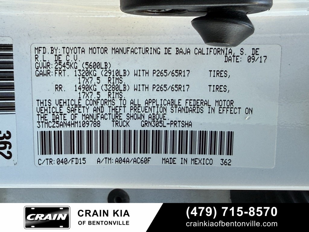 Clean Carfax, 4WD, 130 Amp Alternator, 16 x 7J+30 Style Steel Disc Wheels, 6 Speakers, ABS brakes, Air Conditioning, AM/FM radio, Anti-whiplash front head restraints, ATF Cooler, Axle Ratio: TBD, Brake assist, Bumpers: body-color, Carpet Floor Mats (PPO), CD player, Class IV Hitch Receiver, Cruise Control, Door Sill Protectors, Driver door bin, Dual front impact airbags, Dual front side impact airbags, Electronic Stability Control, Engine Oil Cooler, Exhaust Tip, Exterior Parking Camera Rear, Fabric Seat Trim (FB), Front anti-roll bar, Front Bucket Seats, Front Center Armrest, Front reading lights, Front wheel independent suspension, Illuminated entry, Knee airbag, Low tire pressure warning, Occupant sensing airbag, Outside temperature display, Overhead airbag, Overhead console, Passenger door bin, Power door mirrors, Power steering, Power Steering Cooler, Power windows, Radio: Entune AM/FM/CD, Rear step bumper, Speed-sensing steering, Split folding rear seat, Steering wheel mounted audio controls, Tachometer, Telescoping steering wheel, Tilt steering wheel, Tow Package, Traction control, Trailer Sway Control.