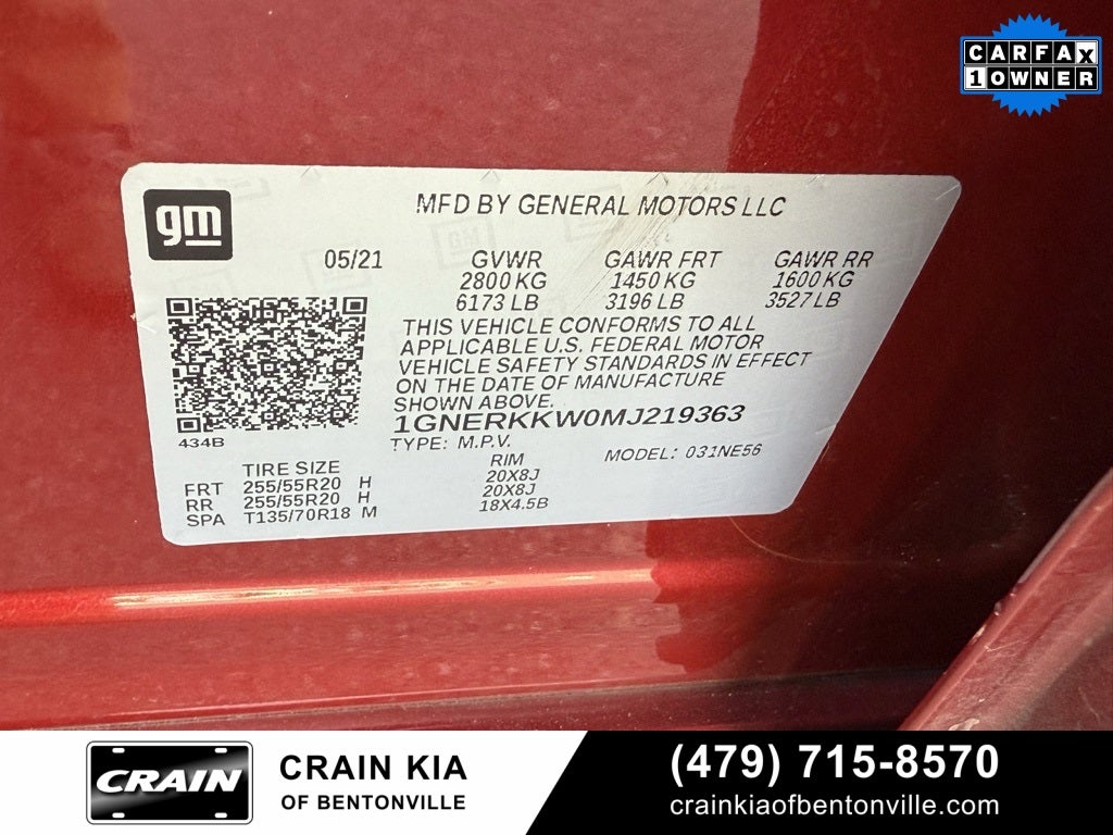 One Owner, 10 Speakers, 3.49 Axle Ratio, 3rd row seats: split-bench, 4-Wheel Disc Brakes, 7-Passenger Seating (2-2-3 Seating Configuration), ABS brakes, Air Conditioning, Alloy wheels, AM/FM radio: SiriusXM with 360L, Apple CarPlay/Android Auto, Auto High-beam Headlights, Auto-dimming door mirrors, Auto-dimming Rear-View mirror, Automatic temperature control, Bose Premium 10-Speaker Audio System Feature, Brake assist, Bumpers: body-color, Compass, Delay-off headlights, Driver door bin, Driver vanity mirror, Dual front impact airbags, Dual front side impact airbags, Electronic Stability Control, Emergency communication system: OnStar and Chevrolet connected services capable, Four wheel independent suspension, Front anti-roll bar, Front Bucket Seats, Front Center Armrest, Front dual zone A/C, Front fog lights, Front License Plate Bracket Mounting Package, Front reading lights, Fully automatic headlights, Garage door transmitter, Heated door mirrors, Heated front seats, Heated rear seats, Heated steering wheel, Illuminated entry, Leather steering wheel, Low tire pressure warning, Memory seat, Navigation System, Occupant sensing airbag, Outside temperature display, Overhead airbag, Overhead console, Panic alarm, Passenger door bin, Passenger vanity mirror, Perforated Leather-Appointed Seat Trim, Power door mirrors, Power driver seat, Power Liftgate, Power passenger seat, Power steering, Power windows, Preferred Equipment Group 1LZ, Premium audio system: Chevrolet MyLink, Radio data system, Radio: Chevrolet Infotainment 3 Premium System, Rear air conditioning, Rear anti-roll bar, Rear reading lights, Rear window defroster, Rear window wiper, Remote keyless entry, Roof rack: rails only, Security system, SiriusXM w/360L, Speed control, Speed-sensing steering, Spoiler, Steering wheel memory, Steering wheel mounted audio controls, Tachometer, Telescoping steering wheel, Tilt steering wheel, Traction control, Trip computer, Turn signal indicator mirrors, Variably intermittent wipers, Ventilated front seats, Voltmeter, Wheels: 20 Argent Metallic Machine Faced Aluminum.